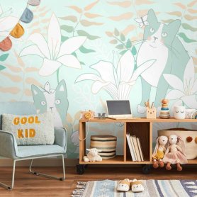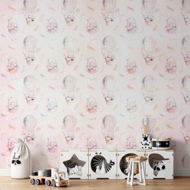 Fototapetti - Solid pattern with feathers - hares in a basket and in a balloon for children